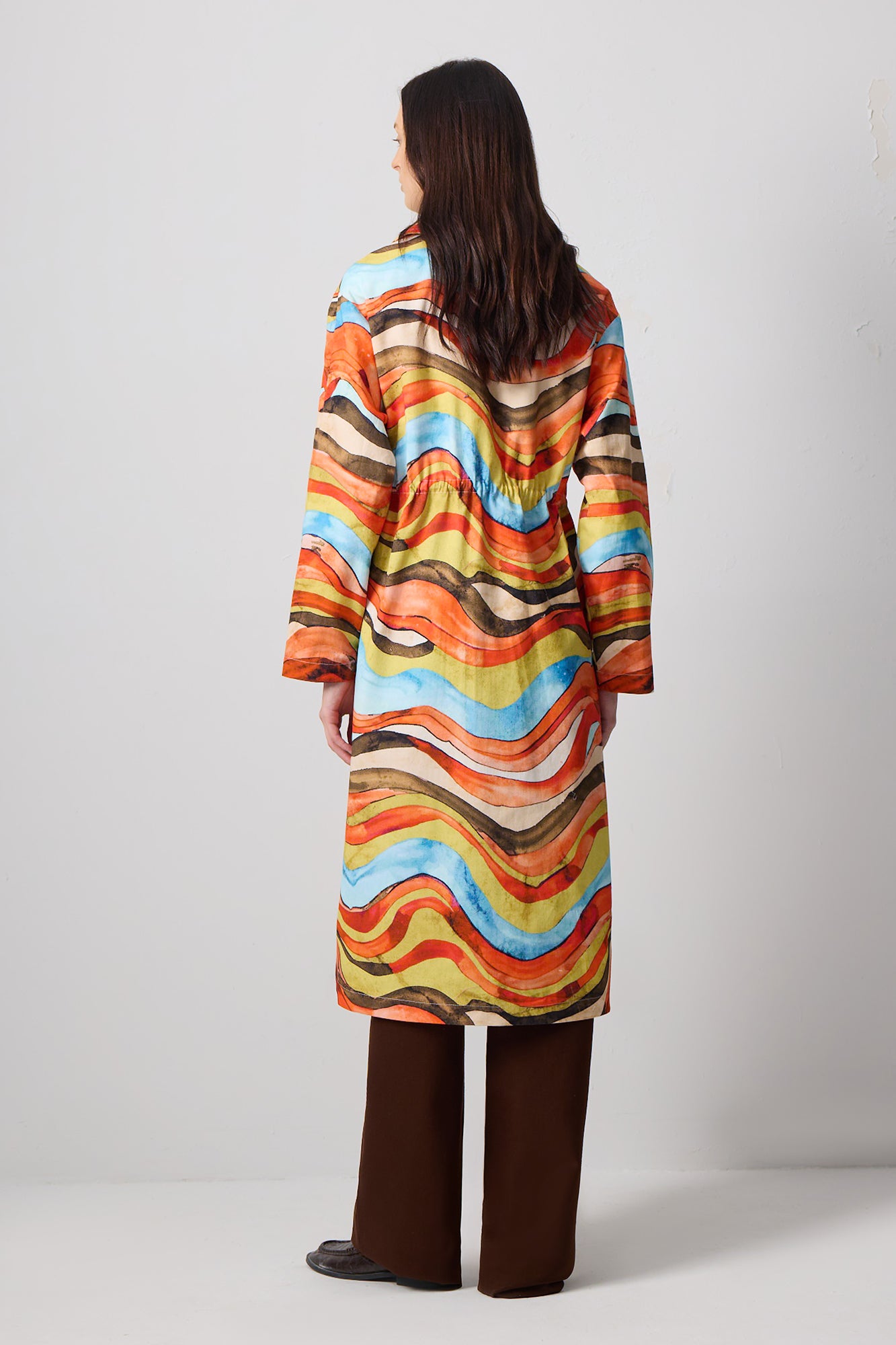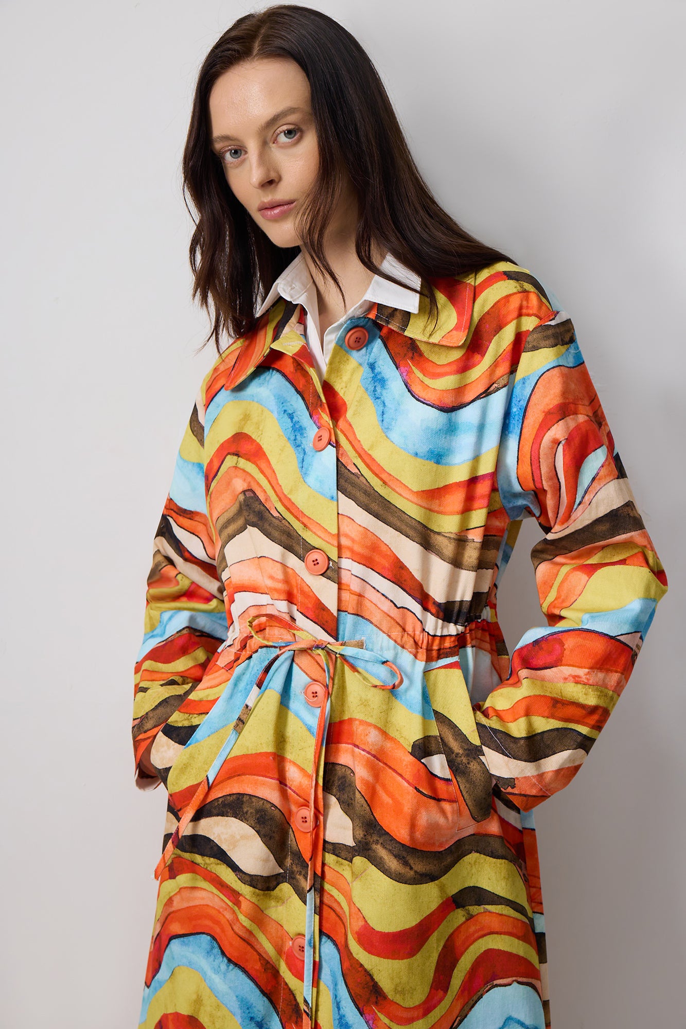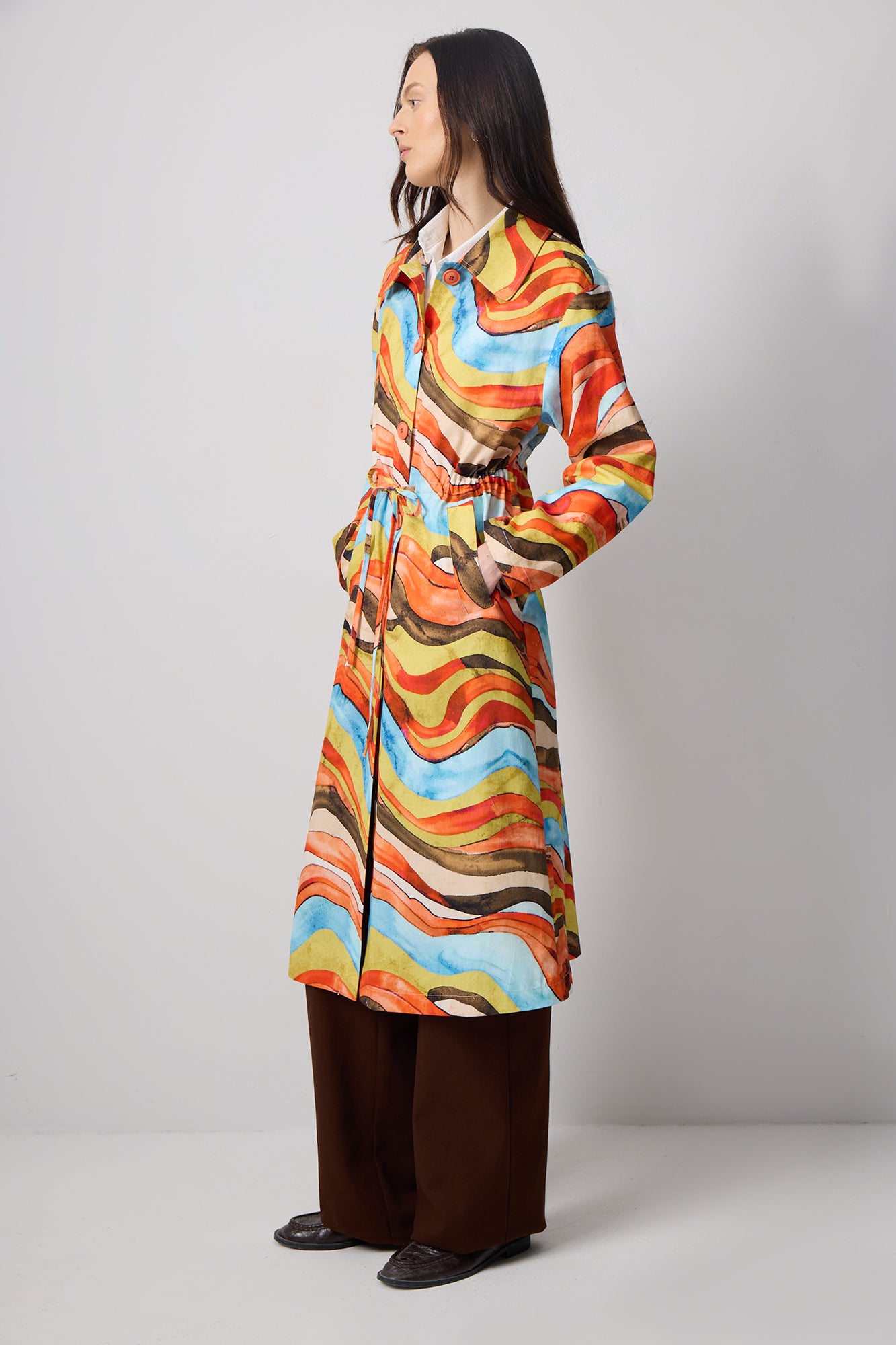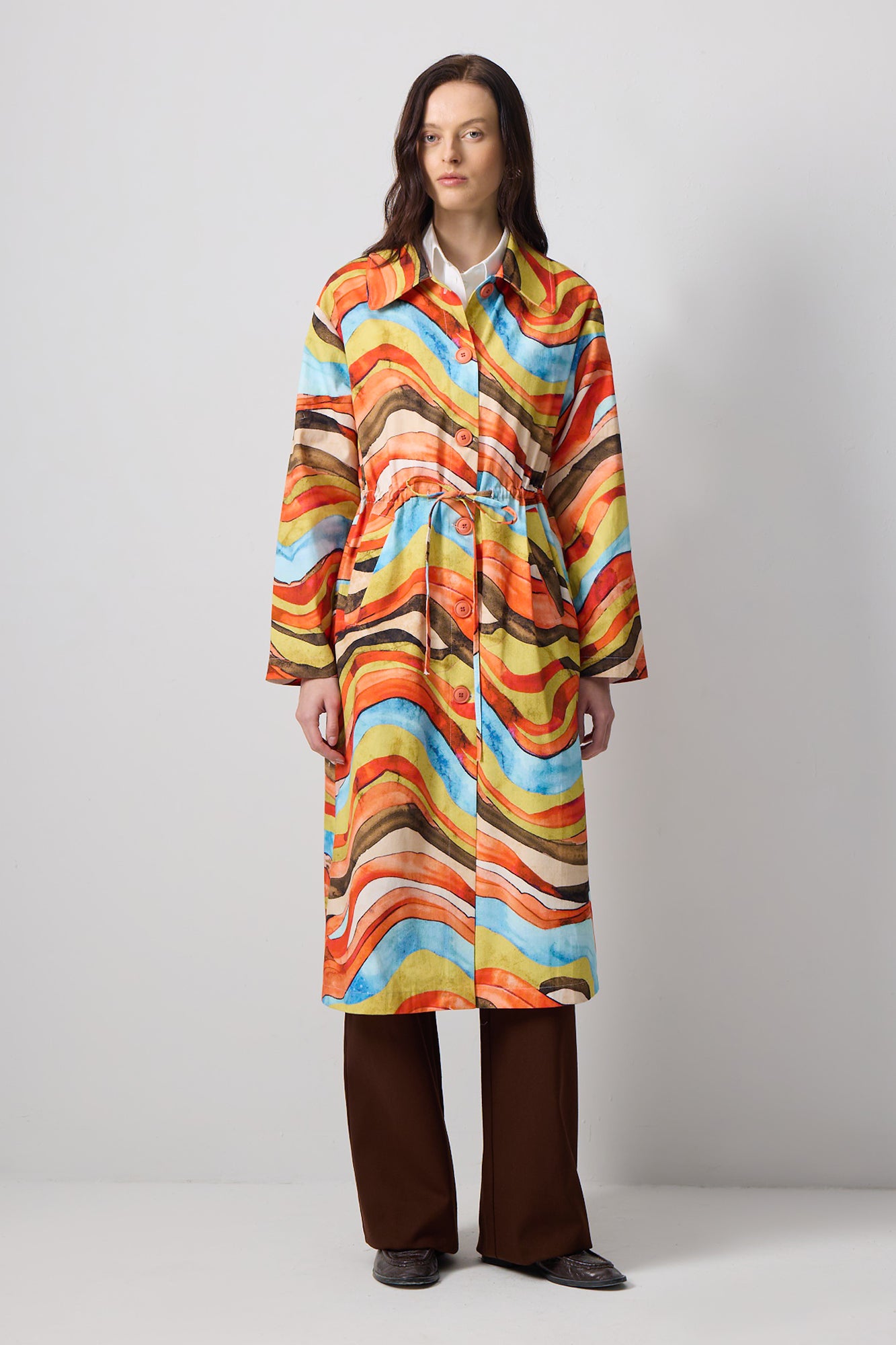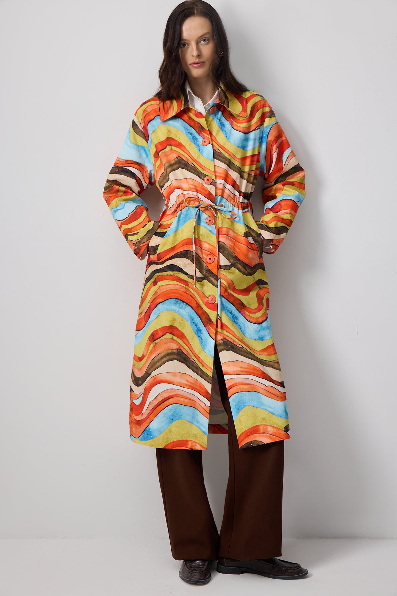 GATHERED WAIST ABSTRACT PATTERNED TRENCH COAT