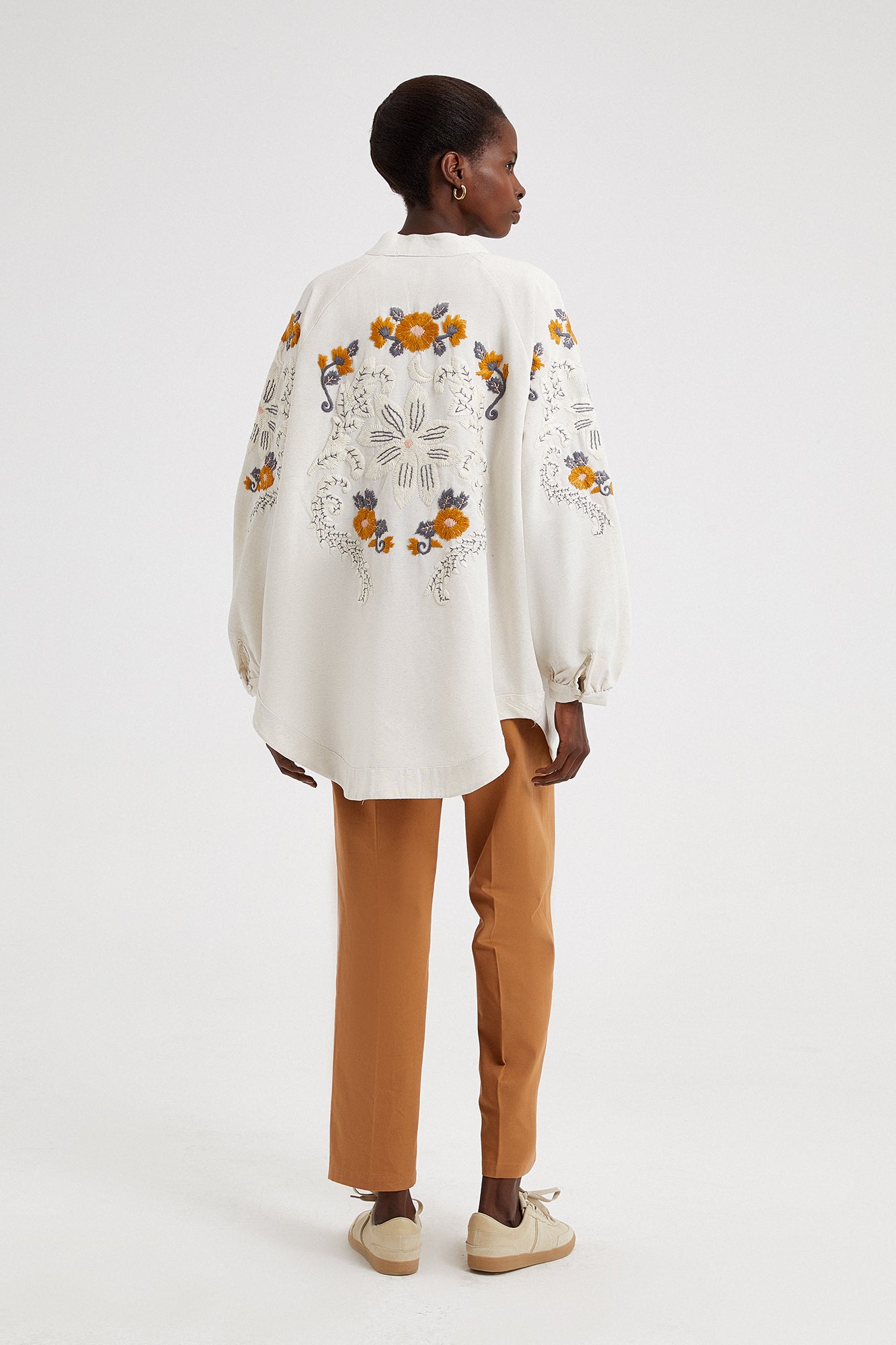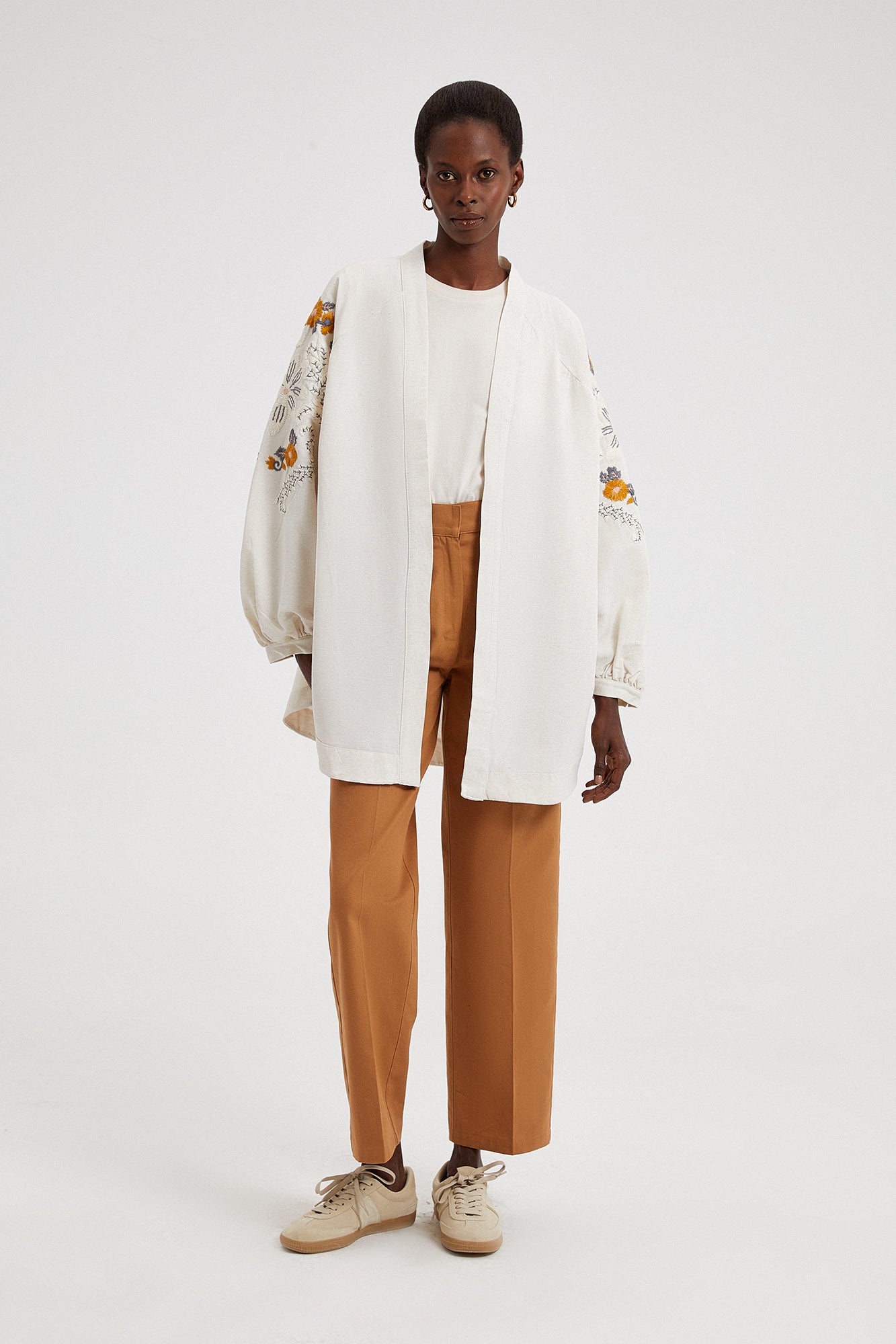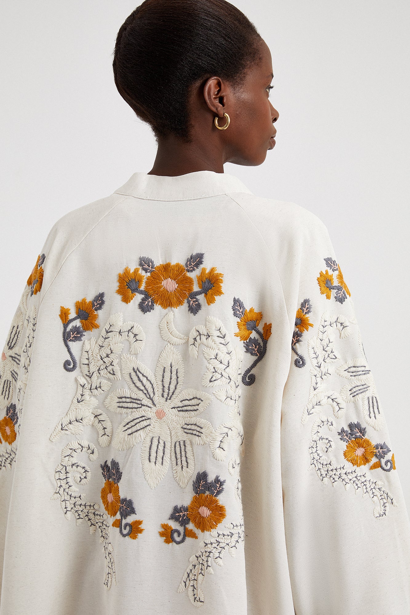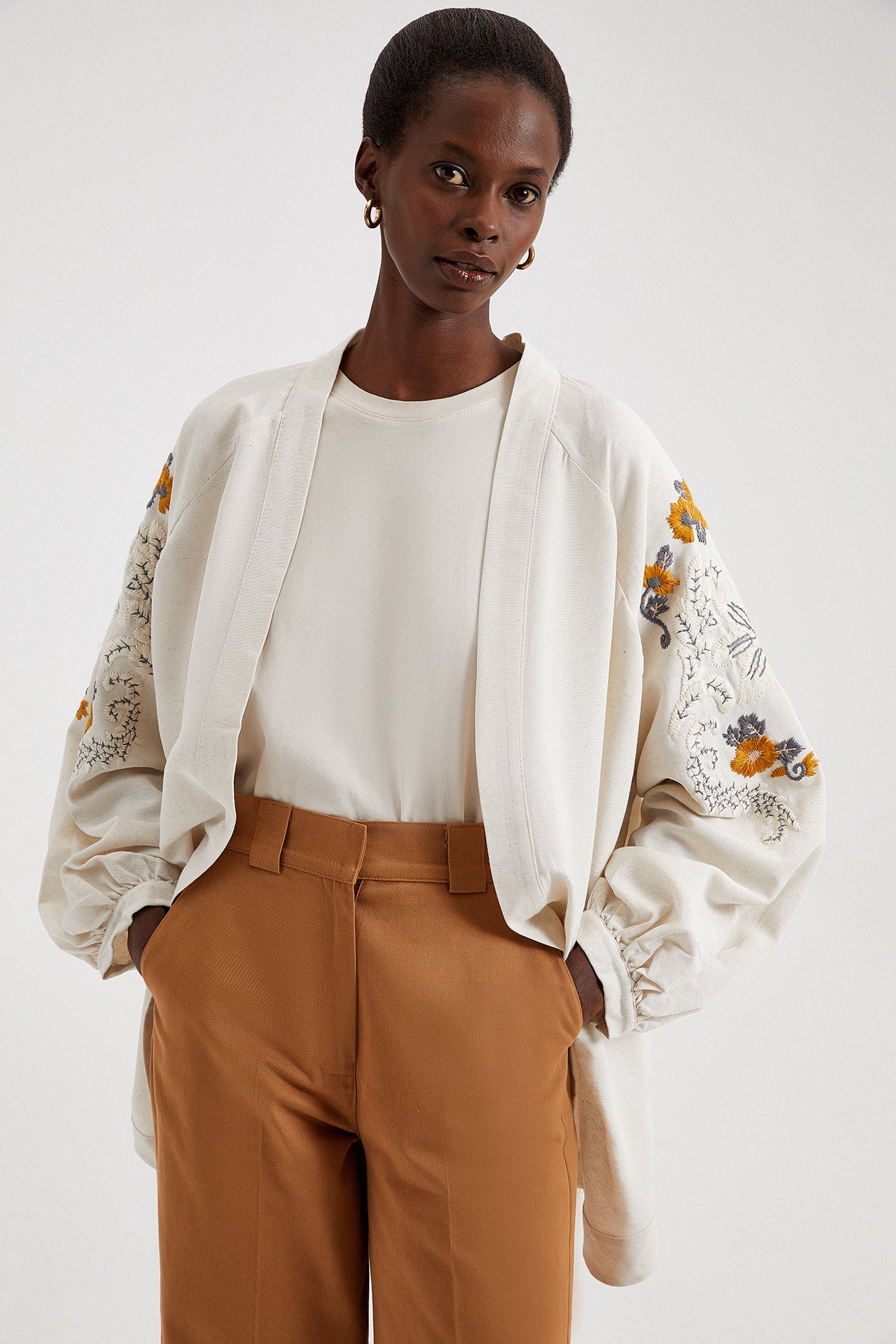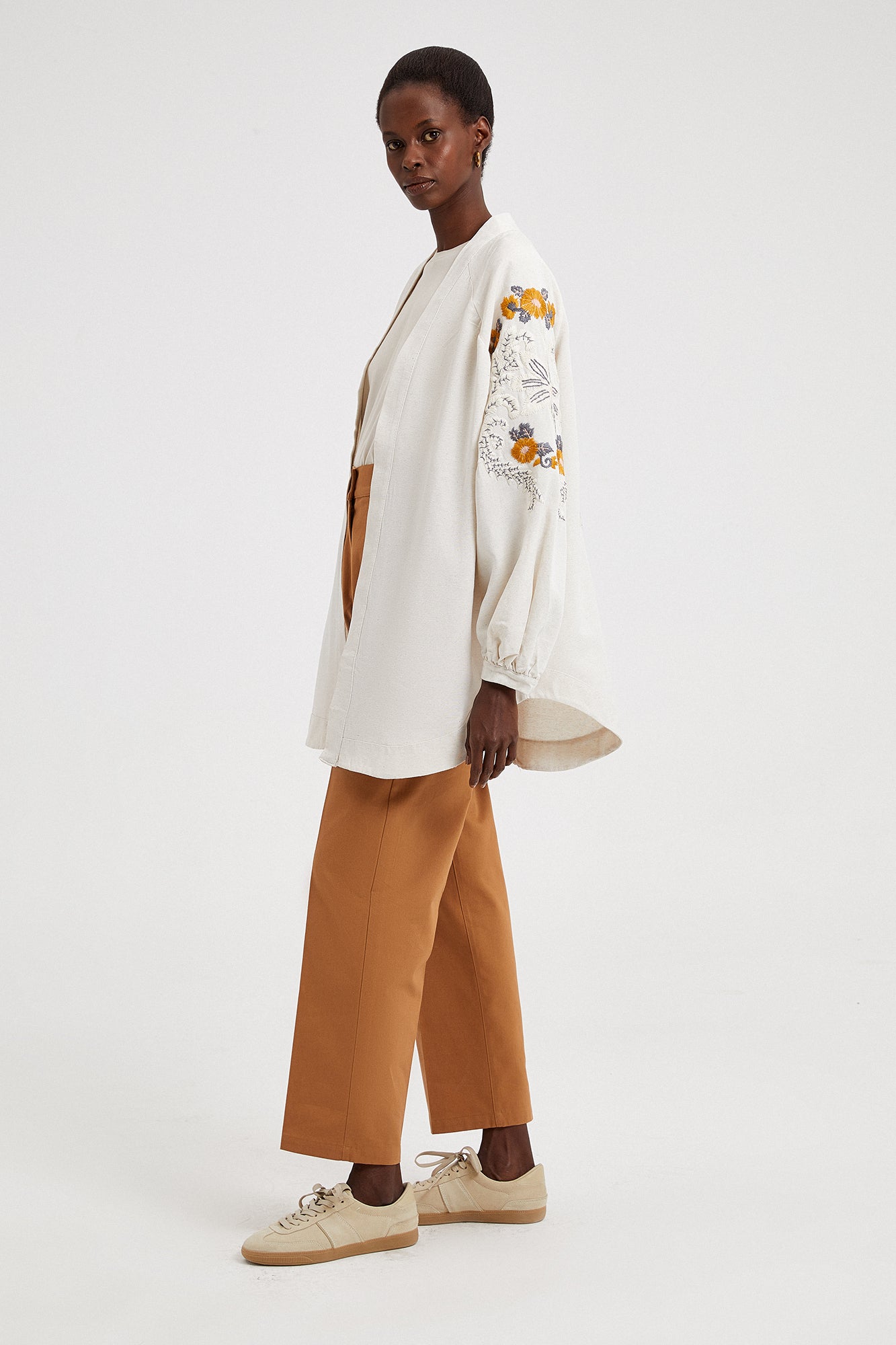 ÇİÇEK İŞLEMELİ KETEN KARIŞIMLI KİMONO